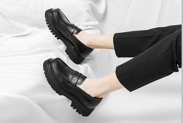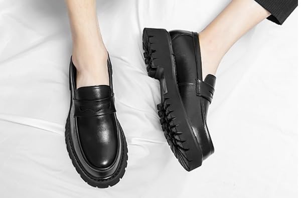 Generic Men's Leather Platform Chunky Slip-On Penny Loafers retro Round Toe Lug Sole Business Casual Formal Work Shoes for Men