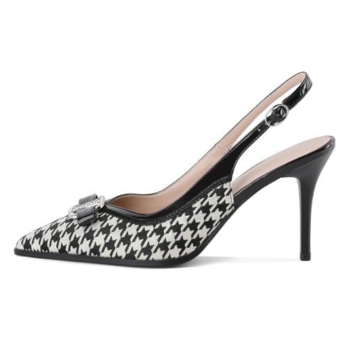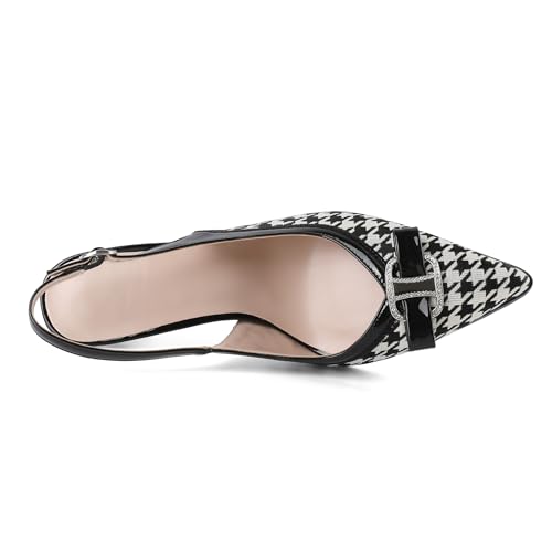 Eldof Women Slingback Heels Rhinestone Buckle Houndstooth Pointed Toe Slip On Stilettos High Heel Pumps Shoes Dressy 3.5 Inches 7