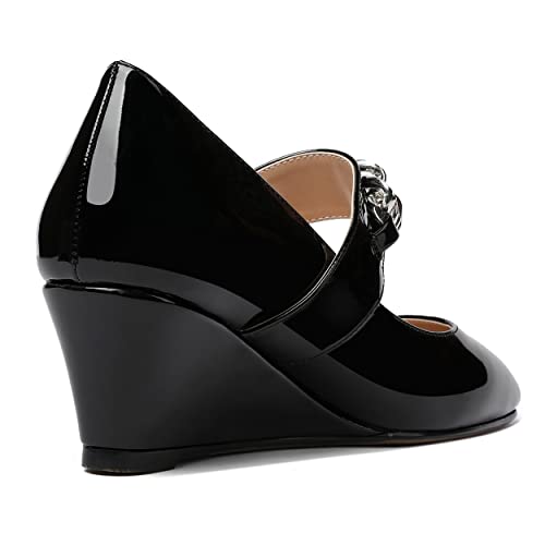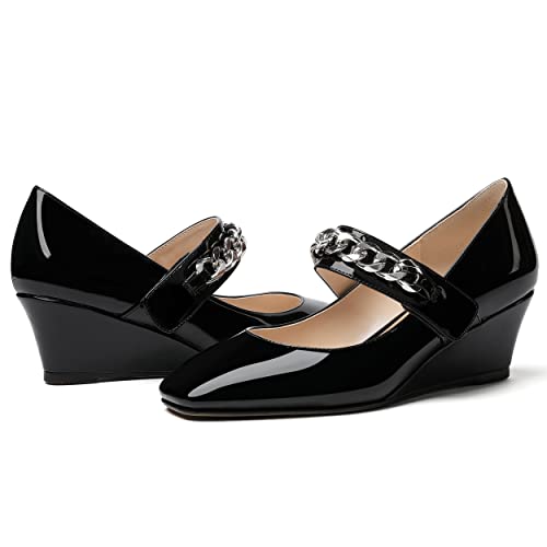 WAYDERNS Women's Slip-on Patent Lace Up Metal Chain Square Toe Mary Jane Wedge Low Heel Pumps Shoes 2 Inch 2