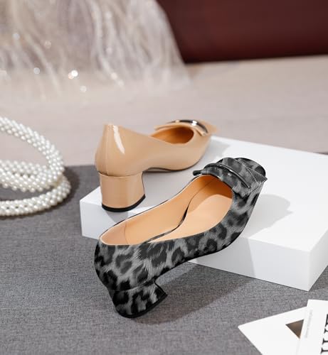 Joseywade Women Low Block Chunky Heel Pumps Square Toe Slip On 2 Inch Closed Toe Comfort Shoes for Wedding Office Evening with Bow Patent Leopard White US Size 7.5 5