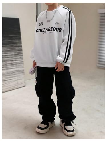 • Fleece striped sweatshirt for boy, long sleeve, crew neck, graphic, drop shoulder, rib knit, pullover, preppy, athletic sweatshirts, workout wear, warm and comfy