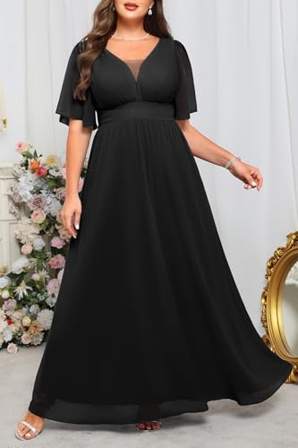 Plus Size Formal Dresses - V Neck Flutter Sleeves Evening Gowns Bridesmaid Wedding Guest Chiffon Long Maxi Dress 1