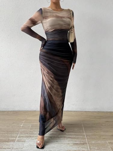 LIGHT DOT Women's Printed Bodycon Maxi Dress Long Sleeve Tie Dye Mesh Layered Dress 1