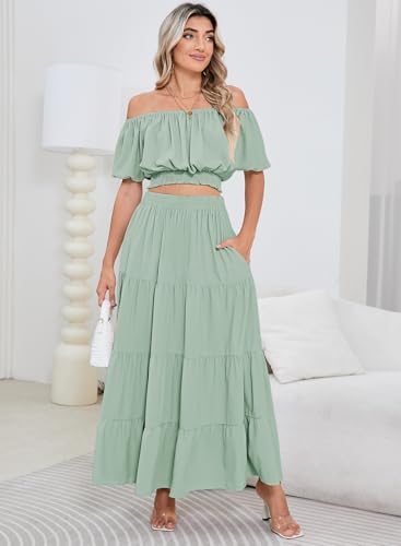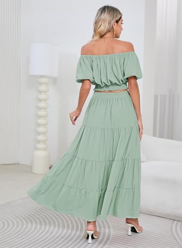 HUUSA 2025 Summer 2 Piece Boho Outfits for Women Short Sleeve Off Shoulder Crop Top and High Waist Flowy Long Skirt Set 6