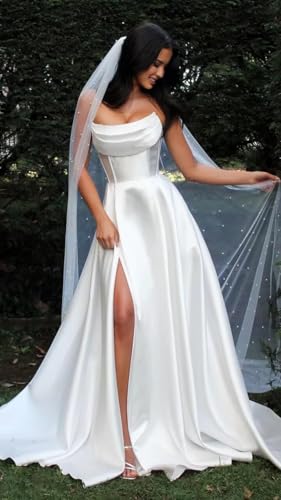 HOT ! Strapless Satin Prom Dresses with Slit Long Corset A Line Formal Evening Party Gowns with Pockets