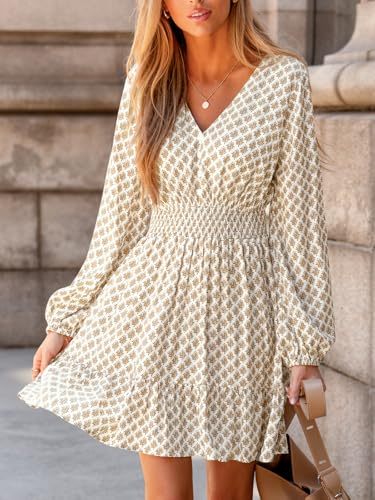 More information about CUPSHE Women Geo V Neck Fall Dress Sleeveless Smocked Waist A Line Long Sleeve Button Casual Sundress Mini Dress