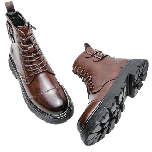 Men's Leather Lace-Up Platform Zipper Combat Botas Fashion Round Head Buckle Strap Lug Bottom Waterproof Chukka Booties Comfort Non-Slip High Top Casual Motorcycle Ankle Boots 7