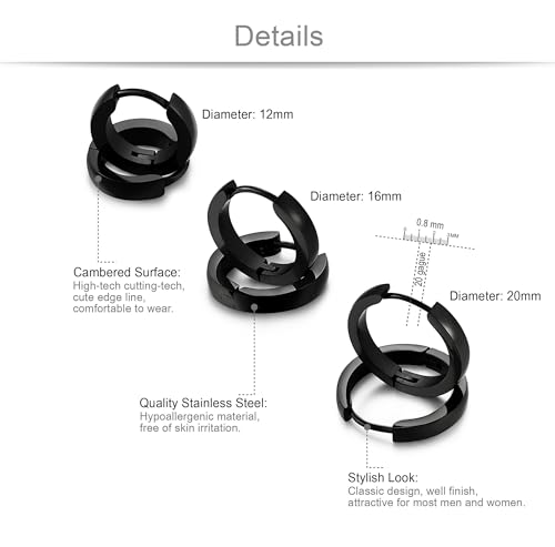 Jstyle 3Pairs Stainless Steel Mens Womens Hoop Earrings Huggie Ear Piercings Hypoallergenic 12/16/20mm 6