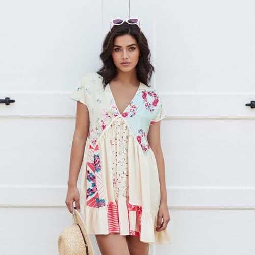 • Design: This graphic beach mini dress adopts deep v neck, short sleeve, floral patchwork, ruffle hem, swing and flowy, a line dress, loose causal and vacation styled design, which makes you look pretty and eye-catching