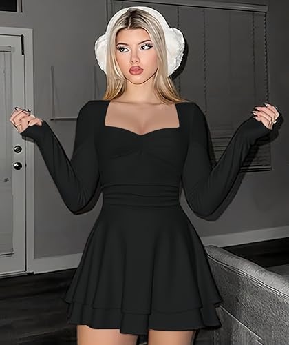AGSEEM Womens Mini Dress Long Sleeve Square Neck Ruffle Hem Corset Ruched Waist A Line Short Party Dresses 1