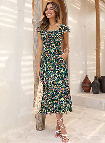 HOT ! DOROSE Women's Summer Floral Dress Square Neck Smocked Boho Midi Dress Ruffle Tie Back Flowy Beach Long Tiered Dress