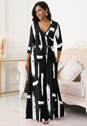 More information about FANDEE Women Print Maxi Dress V Neck 3/4 Sleeve for Women Casual Tie Waist Belted Dresses