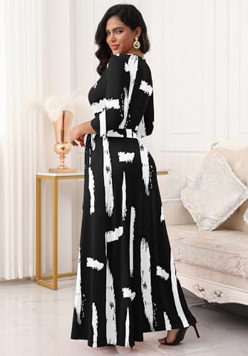 FANDEE Women Print Maxi Dress V Neck 3/4 Sleeve for Women Casual Tie Waist Belted Dresses 3