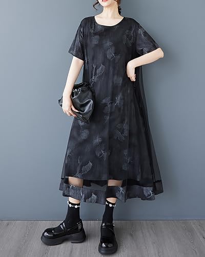 HOT ! ellazhu Women's Dress Crewneck Short Sleeve Floral Printing Tulle Patchwork Flowy Hem GZ513