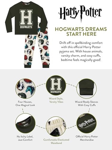 • Magical Hogwarts Design: The green long sleeve top in this boys pajamas set features a bold varsity "H" and “Hogwarts” text, while the beige bottoms show off all four house mascots — making this a standout piece of Harry Potter boys nightwear and a favorite among fans