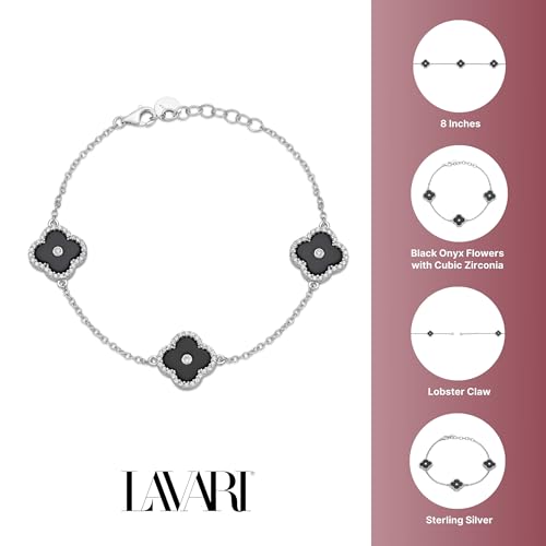 HOT ! Lavari Jewelers Flower Bracelet for Women - Black Onyx Mother of Pearl Malachite & Cubic Zirconia in 925 Sterling Silver - Hypoallergenic Gold Plated - Adjustable Halo Clover Bracelet - Lobster Claw