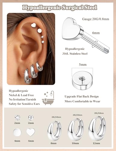 • 4 Pair Flat Back Stud Earrings--Stud earring size are 20G(0.8 mm), post length: 7mm, flat back size: 5mm, small ball and cz: 2mm, dot and heart:4mm. Our flatback earrings are safe and not easy to fall off, convenient to wear. Screw back earrings remove the pain of traditional earrings, perfect for wearing while sleeping, bathing or exercising!
