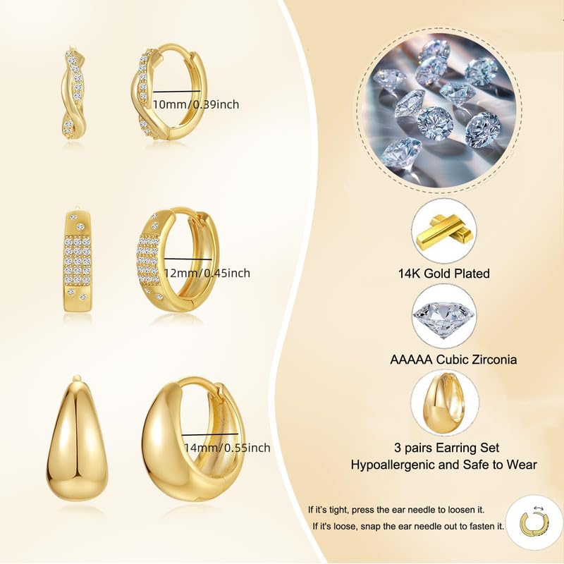 • Gold earrings set: The gold trendy hoop earrings set contains three different sizes and styles of fashion earrings, exquisite design for multiple piercings. The beautiful plating giving them an authentic and elegant appearance.