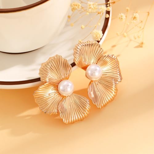 Chunky Gold Flower Pearl Dangle Earrings Dainty Large Floral Leaf Pearls Drop Dangly Earring for Women Vintage Trendy Ginkgo Leaves Statement Jewelry 5