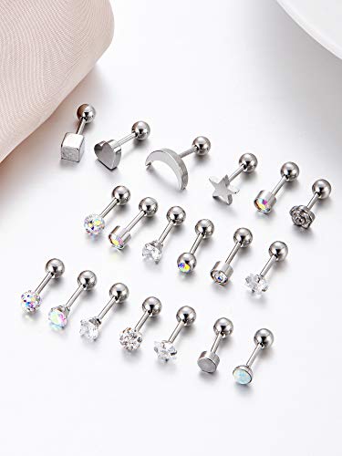 HOT ! 18 Pairs Stainless Steel Stud Earrings Solid Rhinestone Earring Cartilage Earrings Helix Ear Piercing Jewelry for Women Men (Steel Color, 18 G/ 1 mm with 4 mm Screw Ball)