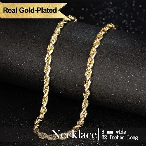 14K Gold-Plated Rope Chain Necklace, 24 Inches, 6mm/8mm Width, Facet Design, Secure Clasp, Unisex, Ideal Gift for Men & Fashion Lovers 1