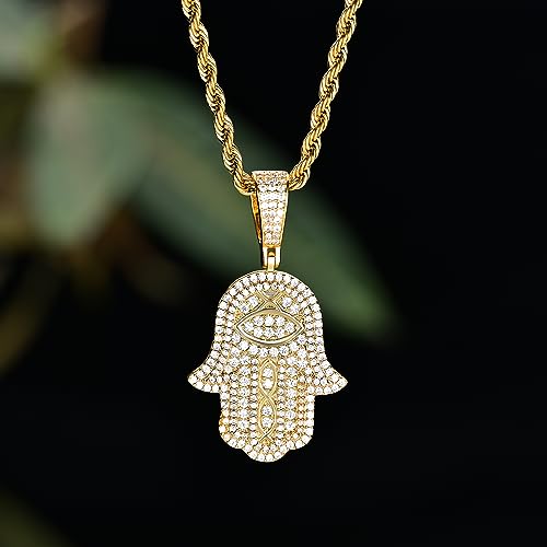 HOT ! 18K or White Real Gold Plated Evil Eye Hamsa Hand Pendant Necklace Iced Out Good Luck Protection Fatima Pendants Chain for Men Women(Custom Box and Pouch Packing)