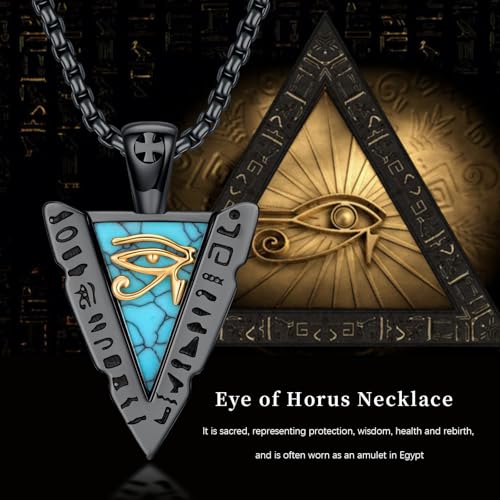 • Unique Design: Black arrowhead necklace features Eye of Horus and engraved ancient Egyptian hieroglyphs. The turquoise Eye of Horus necklace is believed to ward off evil and bring positive energy to its wearer. It serves as a reminder to trust your intuition and embrace the wisdom within.