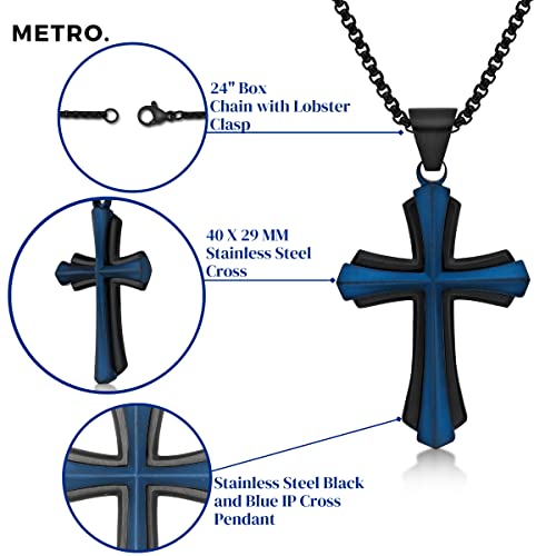 HOT ! Metro Jewelry Stainless Steel Cross Pendant Necklace for Men with Black and Blue Ion Plating on 24 Inches Long Round Box Chain