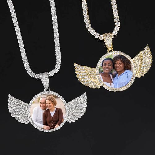 HOT ! Circle Chain with Picture Pendant for Men Women, Custom Chain Personalized Photo Necklace 18k Gold Plated Iced Out Hip Hop Circle Chain with Wings Big Memorial Necklaces CZ Jewelry Rappers Christmas Gift Rope/Cuban/Tennis Chains