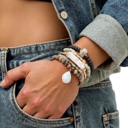 • [ 5 Pcs Natural Stone Beaded Bracelets Set ]:Made of 100% Natural Stone, Turquoise, Jasper, Agate,etc. High quality beads, Crystal and Gemstone which are high quality materials,Smooth and comfortable. With stone pendant decorated, making the bracelet both vintage and fashionable.Bohemian bracelets sets are threaded with strong elastic string. Durable and flexible.With 5 individual single loop bracelets, you can choose to wear one or several to wear.