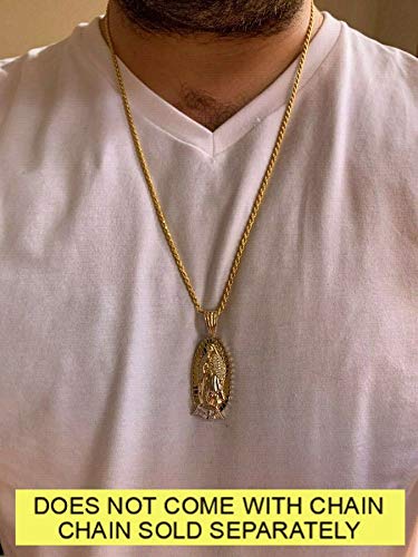 HOT ! HarlemBling Solid 925 Sterling Silver - 14k Gold Plated - Men's Virgin Mary Pendant - Iced Nuestra Señora de Guadalupe