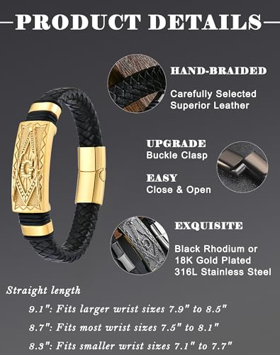 • Stunning Design: YL masonic black leather bracelet for men are made of hand-braided by skilled artisans, 18k gold plated 316L stainless steel, upgrade buckle clasp, easy close and open
