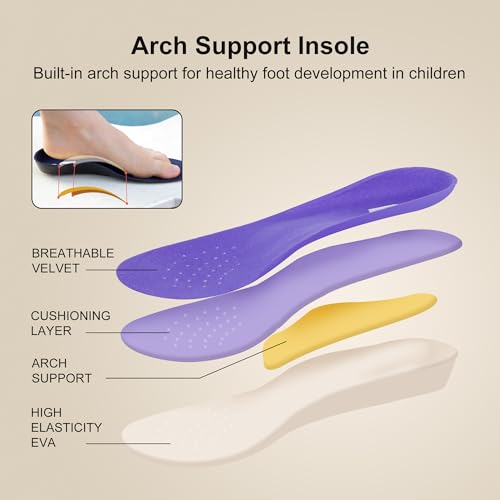 • ARCH SUPPORT: Built-in arch support midsole and removable orthotic insoles are better for kids with flat feet, promoting healthy foot development and comfort during all-day wear. Plus, made with lead-free materials for added safety.