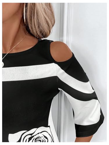 Verdusa Women's Floral Print Cold Shoulder Dress Color Block Half Sleeve Short Dress 4