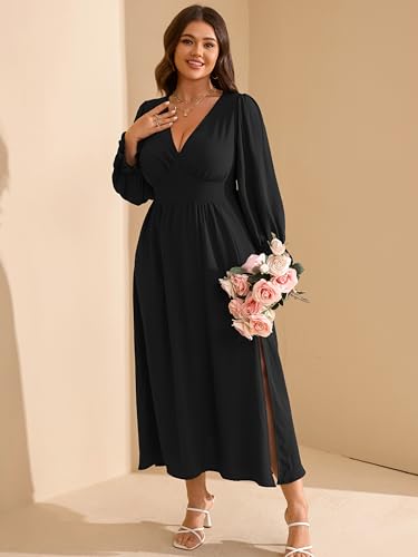 RWJ Plus Size Wedding Guest Dress for Women Deep V Neck Long Sleeve High Waist Slit Formal Cocktail Party Fall Maxi Dresses 6