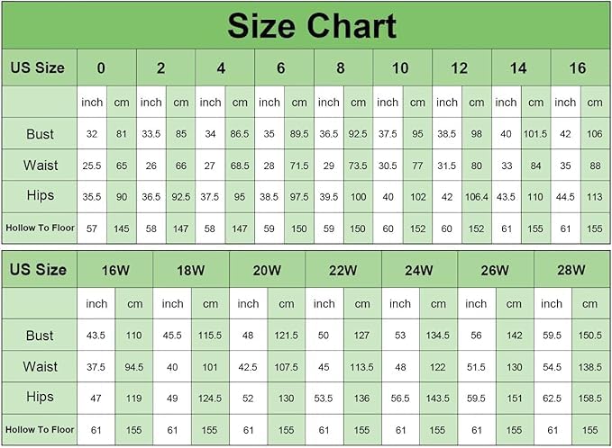 • Size & Fit: Please reference our SIZE CHART on the image. It is more accurate to use our size chart to choose your size. If you are between two sizes, please choose either the larger size or customized service. For the customized dress, please choose the size closest to your own size when you place the order and provide the measurements of bust, waist, hips and hollow to floor