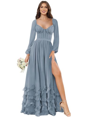 HOT ! SOLODISH Long Sleeve Bridesmaid Dresses with Slit Ruffle Formal Evening Dresses for Women
