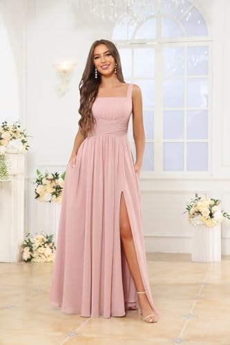 • Features: Chiffon bridesmaid dresses for women, long formal dresses for wedding, spaghetti straps a line evening gown, sleeveless dress for women formal, wedding guest dresses with slit. This long bridesmaid dress features floor length, square neck, lace up back, plus size, fully lined