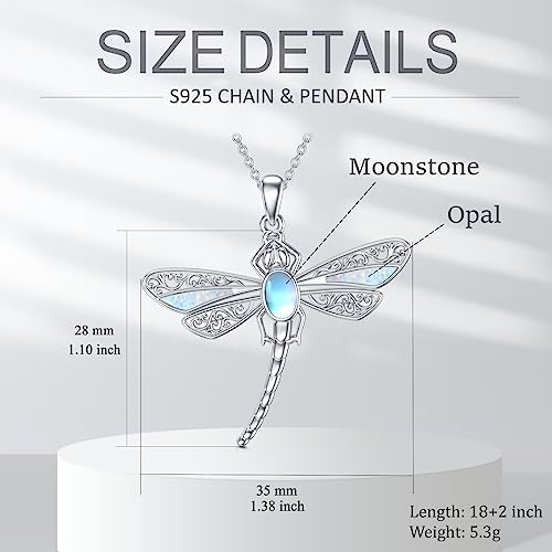 • ◆ PRODUCT DIMENSIONS ◆ Made of 925 sterling silver (stamped with "S925"), this dragonfly opal necklace is nickel-free, lead-free, hypoallergenic, and harmless to sensitive skin. Stone: opal and moonstone. Metal color: silver. Chain: 18 inches sterling silver cable chain. Extension chain: 2 inches. Pendant size: 30.5 * 35 mm (1.2 * 1.38 inches). Weight: 5.3g. Packing: jewelry gift box.