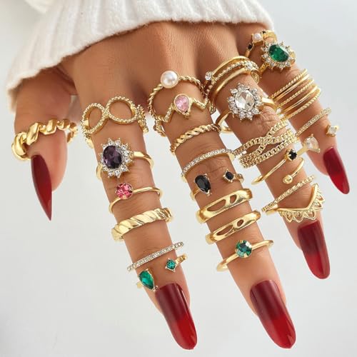 HOT ! 19-36 Pcs Gold Boho Knuckle Rings Set for Women, Vintage Stackable Dainty Joint Finger Gold Jewelry Set with Love Pearl and Sparkling Crystals