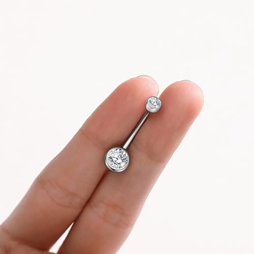 • Sold Individually. Size: Bar Thickness: 14G(1.6mm) Bar Length: 14mm(35/64”), Top CZ: 3.5mm, Bottom CZ: 6mm This is an Internally Threaded belly ring which features a round CZ gem at the top and bottom of the jewelry, giving it a very beautiful and sparkly outlook. Suitable for different occasions.High quality titanium, not easy to deform, healthy for those who are sensitive to other metals.