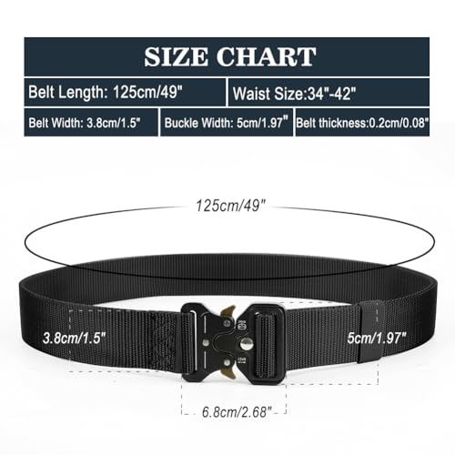 • 【Tactical Belt Size】:Length: 49”(125cm), Width:1.5”(3.8cm), fits waist 34"~ 42". Buckle Size: 1.97"(5cm) in width and 5/16"(8mm) in thickness.