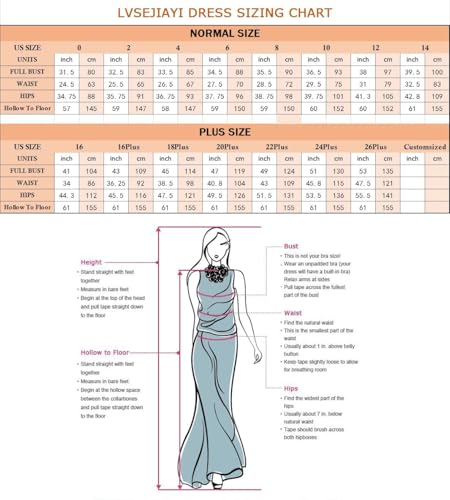• SIZE: We have 0 - 26Plus in standard size. Please refer to the picture (The last one of the main picture)on the left to choose the right size. If you don't confirm your size, you can also choose custom size or color service (no extra charge). If you want to custom size , please send your BUST, WAIST, HIPS, HOLLOW TO FLOOR, HEIGHT, HEEL to us,If you want a custom color, you can send us a photo of the color you want.(FREE CUSTOM).