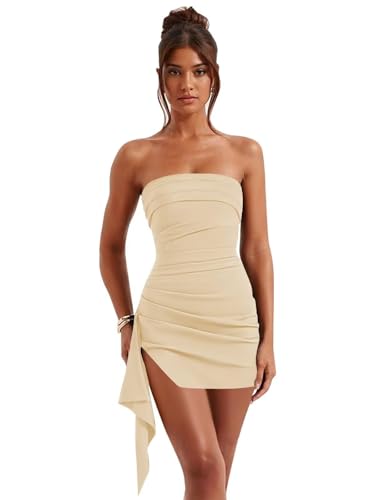 • Dress Features: Satin short homecoming dresses with slit ruffles, strapless, tight bodycon, pleated/ruched, open back/backless, sleeveless, zipper back, above knee length, fully lined, built-in bra, mini graduation cocktail party dress