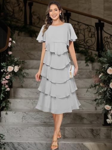 • FEATURES: Chiffon mother of the bride dress for wedding features elegant short sleeve, crew neck, tiered layered design, A-Line hemline. Classy tea length design with extra layer of chiffon fabric and zipper back suitable for more kinds of body shape