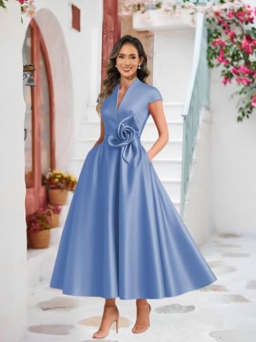 • 【More Style】:Cap Sleeve Mother of Bride Dresses for Women, Satin Bride Mother Dress 2025, A Line Corset Evening Dresses with 3D Flower, V Neck Bridesmaid Dress, Modest Mother of the Groom Dresses, Midi Tea Length Prom Dresses for Women, Pleated Cocktail Dress for Wedding Guest, Satin Party Dresses