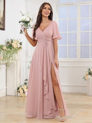 More information about VGZ Women's V Neck Bridesmaid Dresses with Sleeves Pocket Chiffon Long A Line Formal Evening Gown