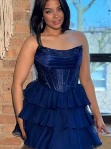 Sparkly Strapless Homecoming Dresses for Teens Tiered Chiffon Short Prom Dress A Line Mini Corset Cocktail Party Gown 6