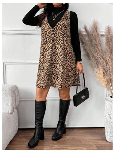 SOLY HUX Women's Plus Size Leopard Print V Neck Short Dress Sleeveless Overall Flowy Fall Dresses 1