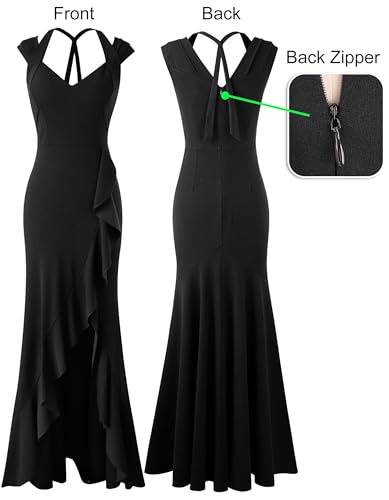 • Style: Halter Sweetheart V Neck, Sleeveless, Straps with a snap button, V Back with A Conceal Back Zipper, Pleated Shoulder, Slim Fit, Mermaid Silhouette, Maxi Length, Asymmetrical Ruffle Hem, Front High Split with an Adjustable Zipper, it can be zipped up to be more sexy or zipped down to be more modest.